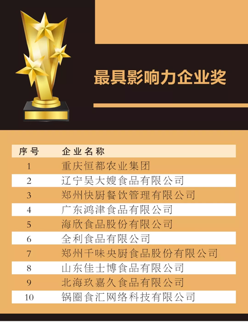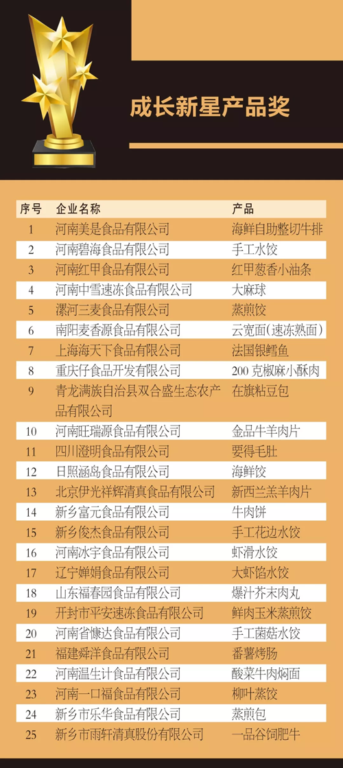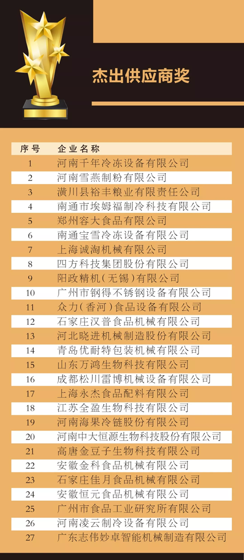 來(lái)源: 冷凍食品網(wǎng) 發(fā)布者:編輯8月18日上午,在2019中國(guó)冷凍食品產(chǎn)業(yè)大會(huì)優(yōu)秀展商頒獎(jiǎng)典禮上,最具影響力企業(yè)獎(jiǎng)、技術(shù)創(chuàng)新獎(jiǎng)、成長(zhǎng)新星產(chǎn)品獎(jiǎng)、杰出供應(yīng)商獎(jiǎng)4大獎(jiǎng)項(xiàng)名單滾燙出爐。